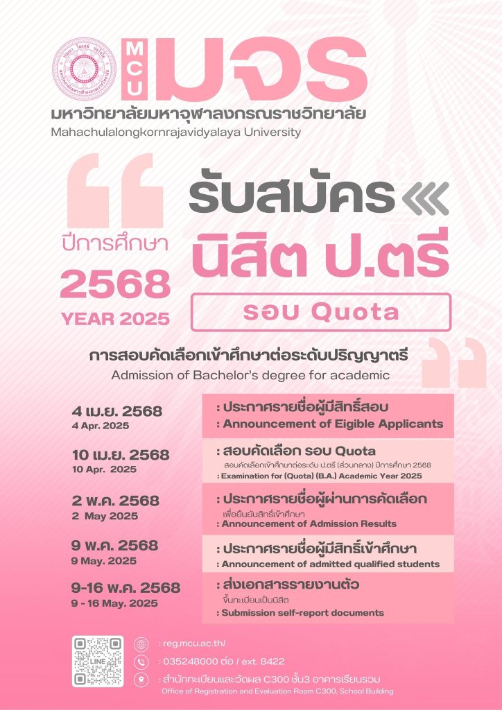 วันพฤหัสบดีที่ ๑๐ เมษายน ๒๕๖๘ พระศรีวัชรสารบัณฑิต, ดร. คณบดีคณะครุศาสตร์ มอบหมายให้ พระครูสมุห์วชิรวิชญ์ ฐิตวํโส, ดร. รองคณบดีคณะครุศาสตร์ ฝ่ายวิชาการ ผศ. ดร.พีรวัฒน์ ชัยสุข รองคณบดีคณะครุศาสตร์ ฝ่ายบริหาร อาจารย์ ดร.วีรพงษ์ แพงคำฮัก หัวหน้าภาควิชาหลักสูตรและการสอน อาจารย์ ดร.สายหยุด มีฤกษ์ หัวหน้าภาควิชาจิตวิทยาและการแนะแนว อาจารย์เอกลักษณ์ เทพวิจิตร รองหัวหน้าภาควิชาหลักสูตรและการสอน พระมหาฉัตรชัย ธมฺมวรเมธี,ดร. เลขานุการสำนักงานคณบดีคณะครุศาสตร์ สอบสัมภาษณ์ผู้สมัครเข้าศึกษาระดับปริญญาตรี (ส่วนกลาง) คณะครุศาสตร์ ปีการศึกษา ๒๕๖๘ รอบที่ ๒ Quota โดยมีผู้สนใจสมัครเข้าสัมภาษณ์ทั้งสิ้น ๓๓ รูป/คน ณ ห้องประชุมคณะครุศาสตร์ และผ่านระบบ ZOOM ออนไลน์
